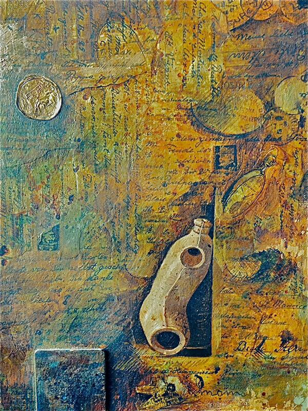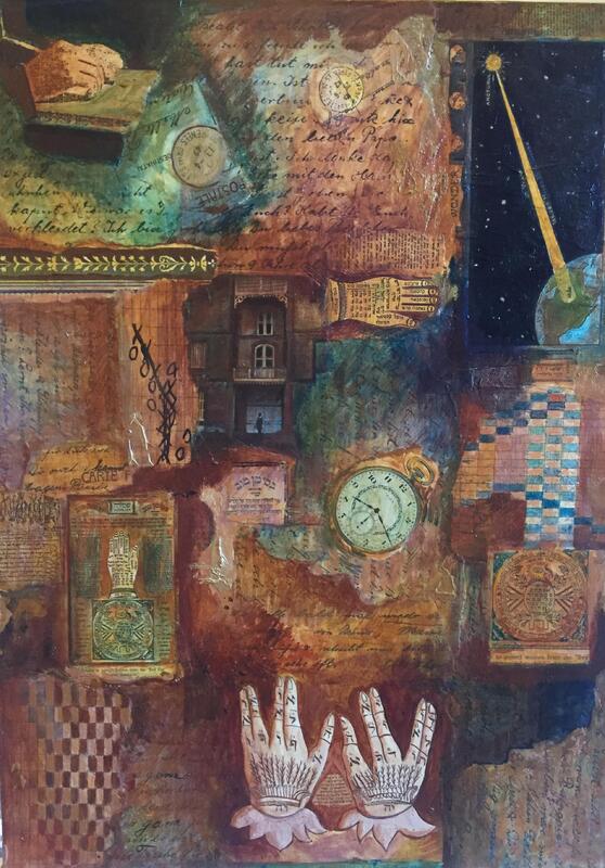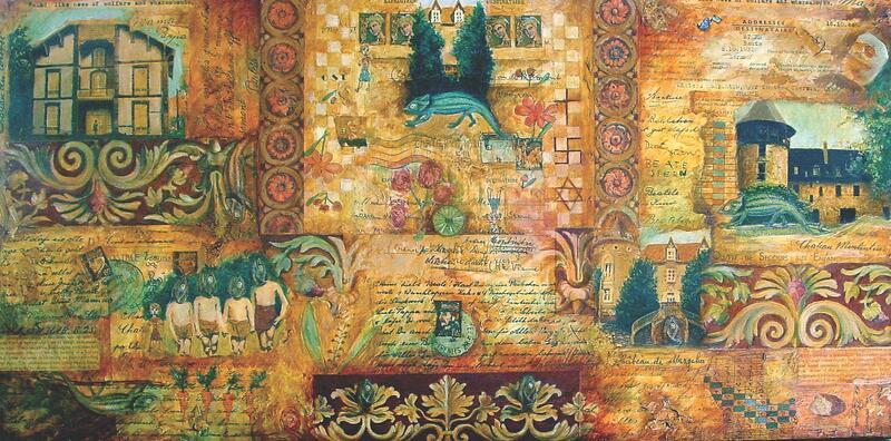 "My mother's experiences as a survivor had politicized me at an early age. I knew from an early age my grandparents were murdered by the Nazis. Over the years, I have tried to sort out what happened and why. Though many questions remain, as an artists and a daughter of a Holocaust survivor I knew I wanted to create a series of works that related to my mother's history. These included larger acrylic paintings, small intimate mono-prints and a series of collage mixed media paintings that include photocopies of my grandparents' letters as well as other ephemera related to my mother's experience. I have exhibited these series in various venues and am please to share some of them with a wider audience." (p.11)