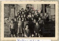 Beate and Susie Stern in group portrait of Jewish Displaced Persons outside the Chateau La Borie children's home in Limoges, France. Beate is the first person on the left in the third row. Susie is standing to the side holding what appears to be a slice of bread.