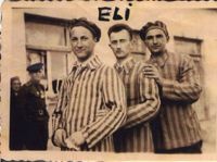 Eli Modenstein, center, in Auschwitz camp uniform, standing with two men in front of his home in Mława after liberation.