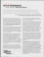 The United States Congress established the Days of Remembrance as the nation's annual commemoration of the Holocaust and created the United States Holocaust Memorial Museum as a permanent living memorial to the victims. This year, Holocaust Remembrance Day is Sunday, April 11, 2010. In commemoration of the 65th anniversary of the liberation of Nazi concentration camps, the Museum has designated Stories of Freedom: What You Do Matters as the theme for the 2010 observance.