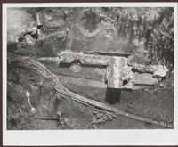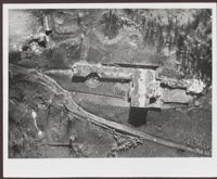 Aerial shot showing Hitler's House, the Eagle Nest, with a crater in it. The back reads, "Signed Sept 29. 45. Le Bombardment Berchtesgaden (Hitler's Home) You may have this one for a gift Hitler's House 1945 note bomb hole." It is stamped with, "CREDIT LINE U.S. Information Agency photo no. 306.NT.844D.1 in the National Archives"