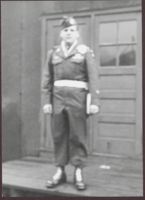 Blurry photograph of Norman standing in his military uniform. The back reads, "VICTORY PARADE 5th Ave with 82n Airborne."