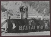 Airborne 1st Battalion members standing on a stage, marked with their insignia and battalion number. The envelope reads, "1945 Col. Robert F. Sink Final 506 Review prior to deactivation Zellam Zee, Austria"