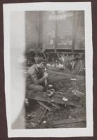 A soldier is sitting in front of a train, eating with a spoon. The envelope is labelled, "9 1945 Canal Scene, France Troops coming home"