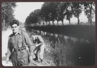 2 soldiers standing on a trail, lined with trees.