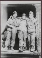 Norman Smith and his friends, in uniform, pose for a picture in a traincar. Norman Smith is on the right.