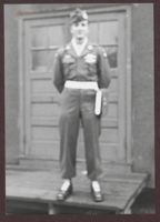 Soldier standing on a platform, hands behind back. The envelope is labelled, "11 12 Jan. 1946 N.Y.C. Victory Parade"