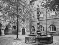 Hildegard Brunnen im Neuen Bau. Hildegard Fountain at "New Building." This building housed the headquarters of the dreaded Nazi police.