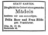 The announcement of my birth in the local newspaper. Translated into English. "In liew of cards, we are happy to announce the arrival of a healthy girl born to us. Felix Baer and wife Hilde Frankfurter. Ulm, December 30, 1925. Karls Street 46." A short time later we moved to an apartment on Kraft Street 11 where we resided until our departure for America.